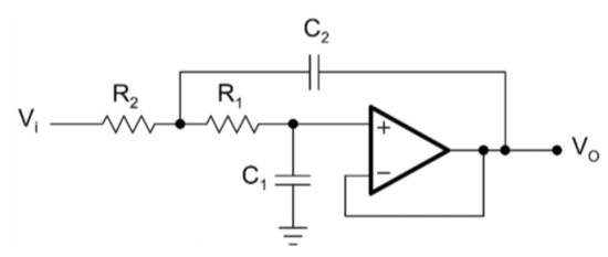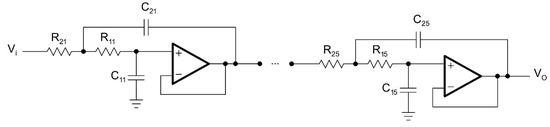 The second order in Sallen–Key topology and the tenth order in Sallen–Key topology circuit diagrams for the LPAF are given in Figure 2 and Figure 3, respectively.