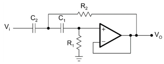 The second order in Sallen–Key topology and tenth order in Sallen–Key topology circuit diagrams for the HPAF are given in Figure 4 and Figure 5, respectively.