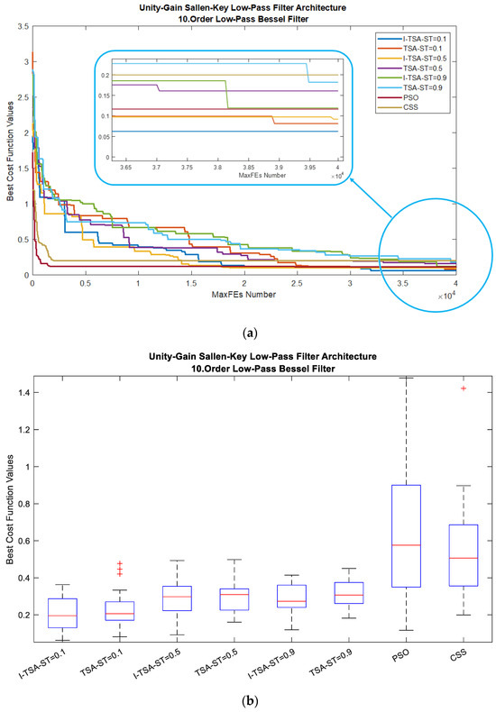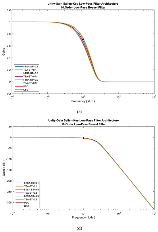 When analyzed according to all ST conditions of the I-TSA, TSA, PSO and CSS, the graphs in Figure 6 are obtained. In Figure 6a, it is seen in the MaxFEs graph that when the ST value is 0.1, I-TSA achieves a more stable convergence and reaches the minimum error value. The box plots obtained from here are given in Figure 6b. In addition, the gain and gain (dB) graphs based on the minimum error value according to the ST values are given in Figure 6c,d, respectively.