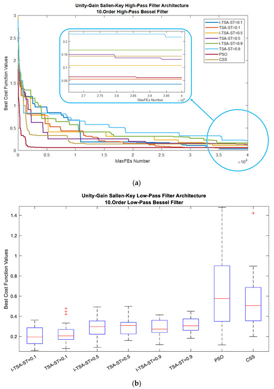 The proposed I-TSA was used to estimate the parameters of the Butterworth and Bessel filter problem. Parameter optimization was also performed on the ST parameter of the I-TSA method, and the ST parameter was determined as 0.1, 0.5 and 0.9, respectively. The estimation results obtained for both Butterworth and Bessel filters are given in the tables, and the gain graphs are shown in the figures. The performance of the proposed I-TSA was also compared with the results of both the basic TSA and PSO and CSS algorithms. Convergence and box plots are also presented. All results are presented under the relevant headings.