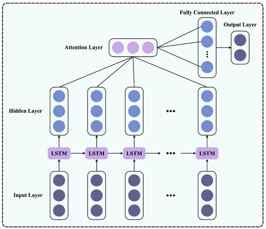 Now denotes the score of the feature vector and a high score designates great attention. shows the weight value of the input feature in the attention module, viz., the score ratio of the feature vector to the entire population. Next, each vector is added and averaged to attain the concluding vector, . Figure 2 defines the architecture of the ALSTM network.