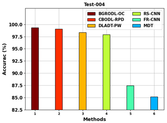 Table 2 shows the average analysis outcomes accomplished by the BGRODL-OC technique and other recent models on two datasets. Figure 4 portrays the comparative average analysis results of the BGRODL-OC method with the existing systems on the test-004 dataset. The experimental values denote that both FR-CNN and MDT systems reached the least average values such as 87.42% and 85.17%, respectively. In addition, the DLADT-PW and RS-CNN techniques achieved a moderate performance with average values such as 98.35% and 97.90%, respectively. Although the CBODL-RPD model attained a considerable of 99.06%, the BGRODL-OC technique exhibited the maximum performance with an average of 99.32%.
