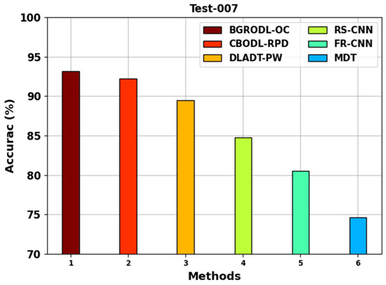 Table 1 shows the comparative accuracy ( examination outcomes achieved by the BGRODL-OC technique on test 004 and 007 datasets [12,24,25]. The results infer that the MDT and FRCNN models attained ineffectual performance. Moreover, the CBODL-RPD, DLADT-PW, and RS-CNN methodologies exhibited significant performance. However, the BGRODL-OC technique accomplished the maximum performance on all the frames.