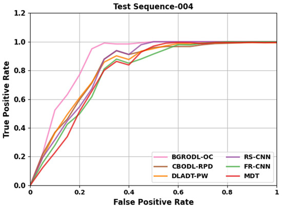 Table 3 and Figure 6 portray the comparative TPR results of the BGRODL-OC approach on test sequence 004. The results show that the DLADT-PW and MDT models obtained poor performance. Then, the CBODL-RPD technique reported slightly decreased performance. Simultaneously, the RS-CNN and FR-CNN methods accomplished considerable results. However, the BGRODL-OC technique outperformed other models with the maximum TPR values.