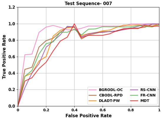 Table 4 and Figure 7 portray the comparative TPR analysis outcomes of the BGRODL-OC system on test sequence 007. The observational data denote that the DLADT-PW and MDT algorithms acquired inferior performance. In addition, the CBODL-RPD approach achieved a moderately low performance. Concurrently, the RS-CNN and FR-CNN methodologies attained notable experimental outcomes. However, the BGRODL-OC system outperformed the rest of the techniques with better TPR values.