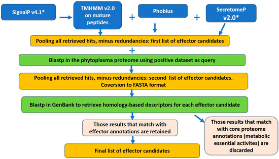 PhyEffector workflow for the prediction of effectors in phytoplasma proteomes. *, programs are run in Gram-positive mode. Mature proteins are signal peptide-lacking proteins. Blue squares, pre-installed prediction tools; green squares, Blastp analyses; pink squares, custom tools for filtering results based on descriptors; yellow squares, lists of effector candidates. All databases were constructed here, except the database of annotations of metabolic essential activities, which was based on the open access report from Cho et al. (2020) [11].