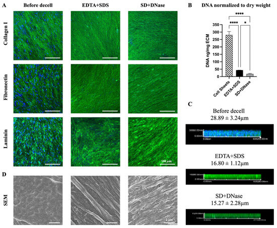 To ensure adequate decellularization of tissue, complete removal of cellular and nuclear components of the host cells is necessary to minimize immunological response. Preserving structural ECM proteins and other biomacromolecules is also critical to maintain ECM function [16]. Decellularization ECM has been widely applied to tissues and organs reconstruction, including corneal [17,18,19], musculoskeletal [20,21,22], cardiac [23,24,25], and neural tissues [26,27,28]. Additionally, various decellularization methods have been employed to generate decellularized ECM from cell sheets [17,29,30,31], tissues [32,33,34,35], and organs [36,37,38,39,40]. Current methods of decellularization include chemical, enzymatic, and physical treatments [41,42]. Chemical treatments, such as ionic, non-ionic, or zwitterionic detergents, can solubilize cell membranes and dissociate DNA from proteins to effectively remove cellular components. However, ionic detergents are powerful and tend to disrupt ECM proteins more than other detergents [31,43]. Enzymatic treatment, such as nuclease or protease, can selectively target and eliminate cellular components. Nuclease removes nucleic acids while protease cleaves proteins to separate undesirable cellular components from ECM. However, prolonged exposure of enzymes can cause loss of glycosaminoglycan (GAG), laminin, and collagen IV, which comprises mechanical stability of ECM [44]. Physical treatment, such as freeze–thaw cycle, agitation, perfusion, uses osmotic or mechanical force to disintegrate cellular components. Precise control of the force applied is required to prevent tissue damage [31,41,45,46]. Therefore, the choice of decellularization method depends on the specific requirements of the application and the type of tissue to be decellularized. Because each method has its own advantages and disadvantages, a combination of multiple methods is often necessary to achieve complete decellularization [6,47].