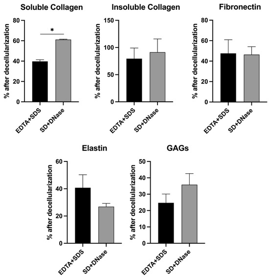 To determine the effect of decellularization methods on the composition of the ECM, major ECM macromolecules including soluble collagen, insoluble collagen, fibronectin, elastin, and GAG were quantified (Figure 2). The results showed significant differences in the levels of soluble collagen between the EDTA + SDS and SD + DNase treatment groups (39.79 ± 5.35% in EDTA + SDS versus 54.46 ± 6.30% in SD + DNase, p < 0.05), with the SD + DNase treatment group preserving higher levels of soluble collagen. However, there were no significant differences in the levels of insoluble collagen (79.48 ± 19.53% in EDTA + SDS versus 91.32 ± 24.48% in SD + DNase) and fibronectin (47.55 ± 12.32% in EDTA + SDS versus 46.34 ± 7.78% in SD + DNase). The level of elastin after decellularization showed a non-significantly higher level in EDTA + SDS treatment group compared with SD + DNase treatment group (40.72 ± 9.57% in EDTA + SDS versus 26.85 ± 2.41% in SD + DNase). Conversely, the level of GAG after decellularization was observed to be non-significantly higher in the SD + DNase treatment group compared to the EDTA + SDS treatment group (24.45 ± 5.36% in EDTA + SDS versus 35.80 ± 6.80% in SD + DNase) (Figure 2).