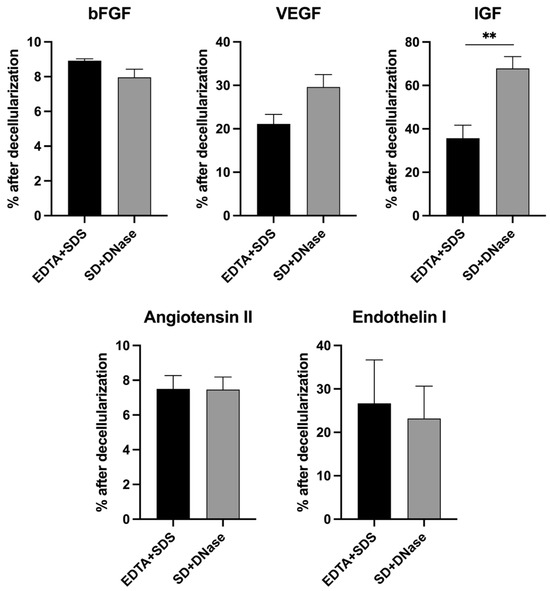 The growth factors embedded within the ECM after decellularization were quantified using ELISA. The levels of IGF exhibited a significant difference (35.67 ± 6.02% in EDTA + SDS versus 67.85 ± 5.46% in SD + DNase, p < 0.01) between the two decellularization treatments, with the SD + DNase treatment group showing significantly higher levels of IGF preserved compared to the EDTA + SDS treatment group. However, there were no significant differences observed for the levels of bFGF (8.92 ± 0.11% versus 7.76± 0.46%), angiotensin II (7.50 ± 0.77% versus 7.47 ± 0.72%), and endothelin I (26.67 ± 10.02% versus 23.19 ± 7.75%) between the EDTA + SDS and SD + DNase treatment groups. The levels of VEGF preserved post decellularization were moderately higher in the SD + DNase treatment group compared to the EDTA + SDS treatment group, although this difference was not significant (21.12 ± 2.20% in EDTA + SDS versus 29.62 ± 2.87% in SD + DNase) (Figure 3).