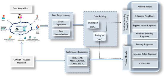 The proposed model is a hybrid model between CNN and GRU, utilized in this paper to predict COVID-19 via IoMT. The proposed model is compared with some ML models, such as Random Forest (RF) Regressor [38], K-Nearest (KNN) Regressor [39], Support Vector Regressor (SVR) [40], Gradient Boosting (GB) Regressor [41], Dummy Regressor (DR), and Bayesian Ridge (BR) Regressor [42], as shown in Figure 1.