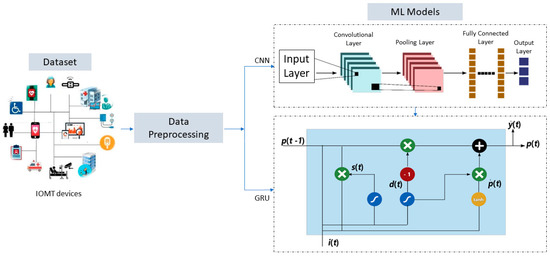 CNN relies heavily on a supervised learning model inspired by how humans naturally pay attention to images. The convolutional neural network (CNN) is chosen over other machine learning models since it does not need any sort of feature extraction preparation [46]. The convolutional, max-pooling, and nonlinear activation layers make up a CNN, a category of deep neural networks. Convolution, the procedure that gives CNN its name, is carried out in the convolutional layer, which is regarded as a primary layer of the CNN. In the convolutional layer, the inputs to the layer are processed by means of kernels. Feature maps are created by convolving all the convolutional layer outputs [47]. Training a CNN model is difficult because of issues with disappearing and growing gradients. Two modern deep learning methods, GRU and LSTM, efficiently deal with this problem. To get around training issues and save the system’s current state across iterations, a new variant of CNN called the GRU has been created [48].