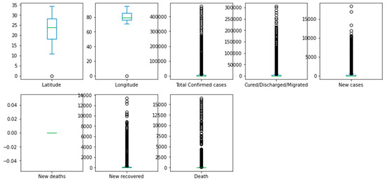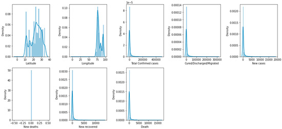 The dataset comprises 4692 instances and eight features, including latitude, longitude, total confirmed cases, cured/discharged/migrated, new cases, new deaths, and new recoveries, with the target feature being deaths. Since we have 4692 cases, 80% of which was classified for training and the remaining 20% for testing, we trained 3754 subjects and tested the remining 938 subjects. A summary of the statistical analysis for the dataset is presented in Table 1.