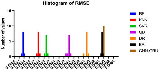 Figure A1 illustrates a comparison between the CNN-GRU model and various models based on RMSE. The RMSE for each model is plotted to facilitate a performance comparison. In Figure A2, histograms of RMSE for both the CNN-GRU model and comparative models are presented, visually depicting the distribution and concentration of RMSE values for each model. Figure A3 showcases QQ plots, residual plots, and heat maps for the CNN-GRU model and comparative models. QQ plots are used to assess the distribution of errors in comparison to theoretical distributions, while residual plots demonstrate the model’s performance by contrasting observed and expected values. The heat map provides insights into data trends and correlations. These visualizations collectively demonstrate the CNN-GRU model’s superior performance in RMSE compared to the models under consideration, offering a comprehensive analysis of the model’s attributes and overall effectiveness.