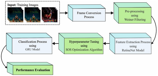 In this research, a novel SOSDCNN-HAR approach was presented for the automatic recognition of the actions of humans. Figure 1 shows the block diagram of the SOSDCNN-HAR procedure. It includes a series of processes, namely, frame conversion, WF-based preprocessing, RetinaNet feature extraction, SOS-based hyperparameter tuning, and GRU-based classification. Primarily, the proposed model enables the frame conversion process, where the videos are transformed into a set of frames. The proposed SOSDCNN-HAR model applied the WF-based noise elimination method to eradicate the noise. Additionally, the RetinaNet-based feature extractor and SOS-based hyperparameter optimizer are applied. In addition, the GRU prototype is enforced for the process of categorization.