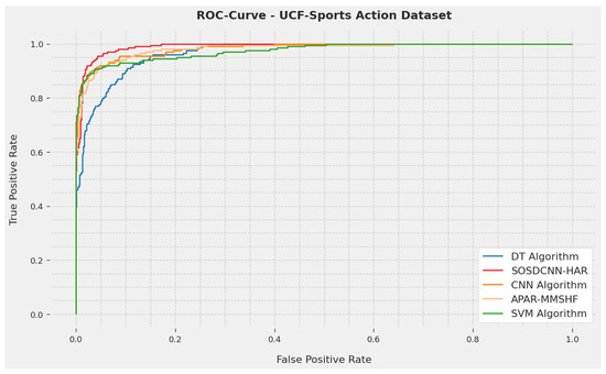 ROC curve evaluation of the SOSDCNN-HAR procedure on the UCF-Sports Action Dataset.