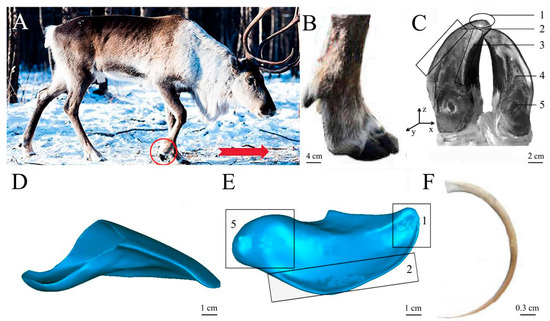 Reindeer sample and ungula model. (A) Reindeer; (B) lateral view of ungula; (C) plantar view of ungula; (D) lateral view of 3D ungula model; (E) plantar view of 3D ungula model; (F) fur of planta pedis. 1—ungula cusp, 2—ungula outer edge, 3—ungula inner edge, 4—ungula sole, 5—ungula capsule.