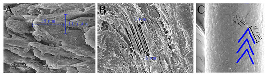 For reindeer in winter, the stance unit of the feet is the only part in contact with frozen soil [26]. Microscopically, the ungula cusp of the reindeer had a serrated rib structure and was severely worn, with many cracks. The ribs on the outer edges were distributed longitudinally with a rough surface. According to the specific size of the ungula cusp ribs, the rib width and length were measured, and the corresponding ratio was 0.65:1 (Figure 3A). According to the size of the ungula outer edge ribs, the rib width and distance were measured, and the corresponding ratio was 3:1 (Figure 3B). In addition, the scales of the plantar fur were very tightly arranged and had large ripples, and the ratio of width to length of the scales was approximately 0.17:1 (Figure 3C). These special structures may play a role in the attachment of reindeer moving on frozen soil.