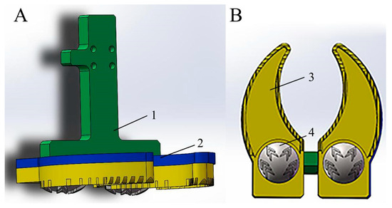 Bionic foot model. (A) Medial view; (B) plantar view. 1—slider connecting plate, 2—foot connecting block, 3—load-bearing toe, and 4—bionic ungula capsule.