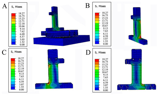Stress distribution at the mechanical foot. (A) Stress distribution of each structure; (B) stress distribution in the medial view of the connecting plate; (C) stress distribution in the lateral view of the connecting plate; (D) stress distribution in the cross-sectional view of the connecting plate.