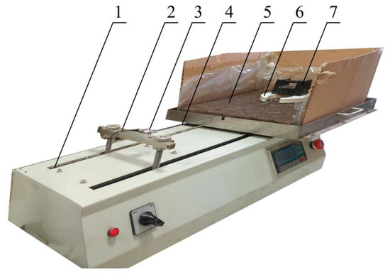 Frozen ground attachment experiments were performed with a UTM friction testing machine (Figure 10). The tray with frozen ground was fixed to the testing machine. One end of the traction line was connected to the attachment foot, and the other end was connected to the tension sensor on the lifting rod. The sensor’s accuracy was 0.0001. The position of the lifting rod was adjusted to keep the traction line horizontal. After the lifting rod was fixed, it moved horizontally and uniformly on the electric track. The moving speed range and maximum moving distance were 10–500 mm/min and 200 mm, respectively.