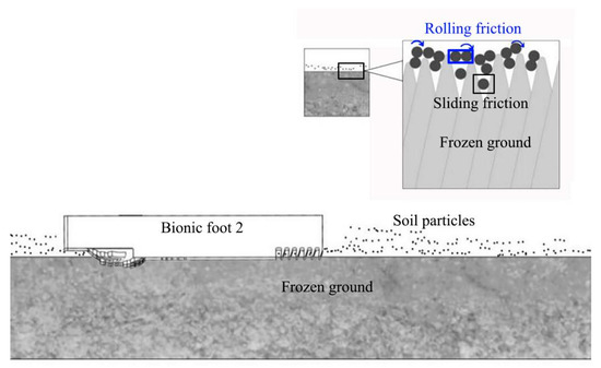 Based on the observed results and the analyses of the experimental data, when interacting with the undisturbed frozen soil, the bionic foot with ribs and ungula capsule (bionic foot 2) can be embedded into the frozen soil (Figure 12). The bionic foot 2 increased the embedded depth through the bionic ungula capsule, and the anterior of the bionic ribbed foot had better traction performance. There were many soil particles unconsolidated with ice distributed on the surface of the undisturbed frozen soil. When the foot interacts with the frozen soil, they can be embedded into the soil, further increasing the soil particles on the surface of the frozen soil. This part of the soil particles began to roll upon the interaction with the foot, and the frozen soil generated rolling friction with the foot, which reduced the attachment performance of the foot.