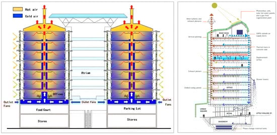 Similarly, Mick Pearce’s CH2 Melbourne demonstration office building is a model for future high-rise buildings, setting a world-class standard for sustainable design, with the Green Building Council of Australia rating the CH2 Melbourne demonstration office building as a six-star green building (six stars being the highest possible rating). The design of CH2 harmonizes the occupants with the surrounding environment. The atrium, which references a termite nest, is designed to be more functional than visual. Mick Pearce designed the building’s interior in reference to the workings of a termite colony, and CH2’s atrium features a precast corrugated concrete ceiling. The wavy space extends as far as possible to absorb the heat released by the occupants of the space below and to promote air flow. The building maximizes the use of internal ventilation improvements for temperature regulation and control, and the connectivity of the building is one of the key techniques used in the systematic solution to reduce the energy consumption of the temperature control, as shown in Figure 2.