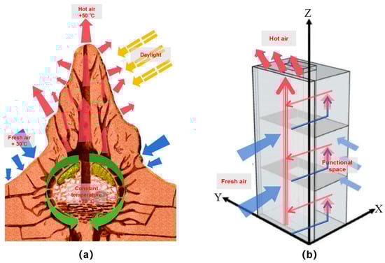 Bionic schematic: (a) Termite mound ventilation schematic. (b) Schematic diagram of bionic termite mound ventilation for a high-rise building.