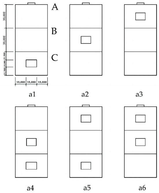 To analyze the efficient scheme of the internal chamber structure of the bionic termite mound, after obtaining the standard model of the studied high-rise building with the main chamber, the morphological bionics of the attached chamber structure of the bionic termite mound are further carried out on the basis of the main chamber of the standard model. To reduce the energy consumption of the mechanical ventilation of the high-rise building model and to obtain a more efficient natural ventilation, the study proposes to set up a ventilation window with a larger area in the outer interface of the main chamber. However, according to Figure 3 and Figure 5, it can be seen that the number and size of the attached chamber openings of the termite mound chamber are not the same, the overall upper middle and lower parts will have more ventilation openings, and the purpose of opening different numbers of ventilation openings in different locations is to achieve the maximization of the ventilation performance of its interior. Based on this, analogous to the bionic high-rise building model of this study, under the relatively fixed setting of the internal interface, the different opening positions of the ventilation windows on the external surface will have different impacts on the wind environment of the whole building. To obtain more accurate data, the study divides the façade near the main chamber into three parts, A, B and C, increases the single-attached chamber and double-attached chamber in different positions to build six building models, and conducts CFD simulations individually. The reason for this setup is, on the one hand, to more accurately mimic the structural morphology of termite mound chambers and, on the other hand, to maximize the benefit of natural ventilation of the high-rise building model. The sketches of the six high-rise building ventilation attached chambers are shown in Figure 6.