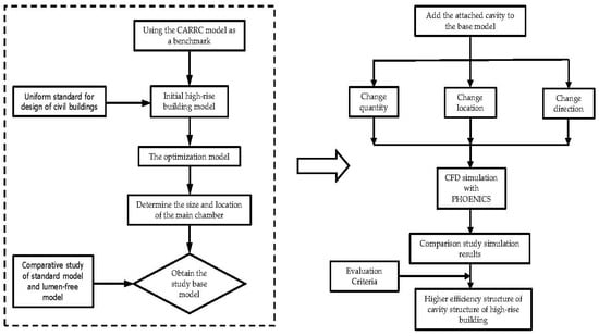 In the research process, the study first optimizes the CARRC international general high-rise building model to obtain the standard model for this simulation. Second, using the mathematical analysis method and the comparative research method, CFD simulation is carried out for the six types of altered attached chamber structural forms proposed by the standard bionic high-rise building model, and a comparative analysis of simulation effects is carried out. Finally, by combining the evaluation criteria set in the article, the model structural pattern with the optimal efficiency of natural ventilation in high-rise buildings using chamber structures is determined. The advantages of this research process include two main points. First, as with the termite mound chamber ventilation performance, natural ventilation is used to simulate the wind environment of the high-rise building model to minimize the energy consumption of the building. Second, through the comparison of six models, we explore the rationality of the distribution law of the accessory chambers in the same way as the termite mound ventilation structural pattern, i.e., we discover the optimal connectivity performance and the optimal model of the high-rise building model through the comparison of the models. The research framework is shown in Figure 7.