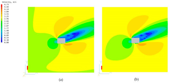 Wind speed maps at the pedestrian walkway (1.5 m) without and with the chamber model: (a) Wind speed maps with the chamber model. (b) Wind speed map with the main chamber model.