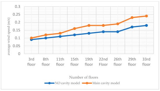 - Average indoor air velocity: the average air velocity of the cutoff plane at 1.0 m of the main working height of the human body in the functional rooms of each floor is selected as an evaluation index for analysis. Relevant research results show that when the indoor air velocity reaches 0.20~0.30 m/s, it can ensure a human physiological sensation in the comfortable range. The results of related research show that when the indoor air velocity reaches 0.20~0.30 m/s, it can make people feel comfortable [21];