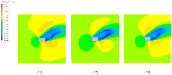 Wind speed maps of three single-attached chamber models at the pedestrian (1.5 m): (a1) Model a1 wind speed map. (a2) Model a2 wind speed map. (a3) Model a3 wind speed map.