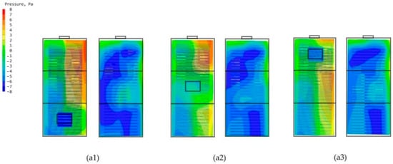 Windward and leeward pressure clouds: (a1) Model a1 windward and leeward surfaces. (a2) Model a2 windward and leeward surfaces. (a3) Model a3 windward and leeward.
