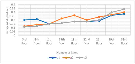 - In this study, the CFD simulation data of the 11th standard floor, the 22nd standard floor, and the 33rd standard floor of the standard high-rise building model are used as the main evaluation basis for the average wind speed at the standard floor.