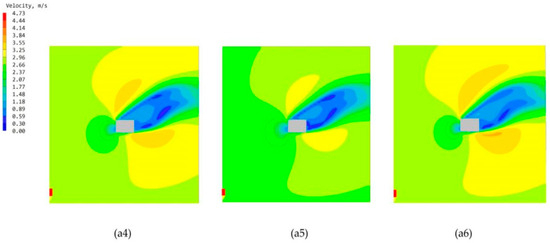 Wind speed maps of three double-attached chamber models at the pedestrian walkway (1.5 m): (a4) Model a4 wind speed map. (a5) Model a5 wind speed map. (a6) Model a6 wind speed cloud.