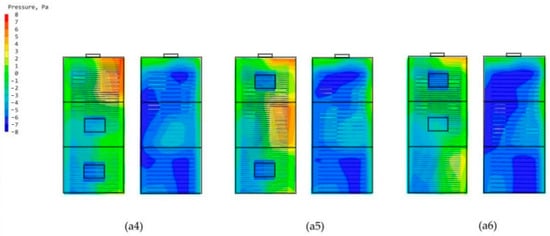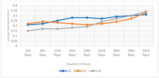 From the chamber structure of the termite mound, it can be found that the attachment chamber system is composed of multiple attachment chambers. The distribution number of chambers in different locations is not the same, and the different number of different areas naturally leads to different open areas of the attached chambers. Therefore, to study the wind environment characteristics of the bionic termite mound chamber structure high-rise building model under natural ventilation conditions, this study, after studying the performance of different individually attached chambers, sets up a double-chamber structure on the side close to the main chamber, and the combination of the two attached chambers is distributed in different locations, which forms three structural forms of a4, a5, and a6, as demonstrated in Figure 6. Such a setup, on the one hand, improves the authenticity of the bionic and, on the other hand, can also maximize the exploration of the optimal ventilation performance of the high-rise building model under natural ventilation conditions. After the simulation operation, Figure 15 shows the three forms of high-rise building pedestrian office [34]. The simulated cloud diagrams of wind speed, and the pressure cloud diagrams of the windward and leeward sides of the three are shown in Figure 16; and the average wind speed data of CFD simulations of some standard floors of high-rise buildings with different double-attachment chambers modes are shown in Figure 17.