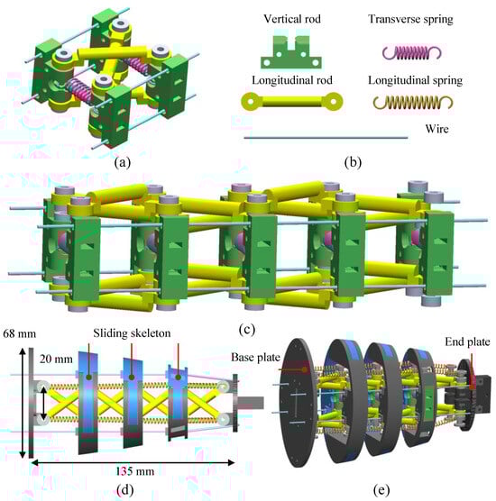 Illustration of a bionic tensegrity body. (a) Modular tensegrity unit. (b) Tensegrity components. (c) Tensegrity structure with four tensegrity units. (d) Top view of the tensegrity robotic fish body. (e) Side view of the tensegrity robotic fish body.