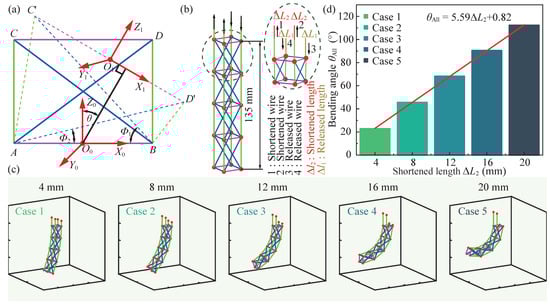 Define the length of and . Let the length variation of two groups of wires in a tensegrity unit as and , respectively. Then, the length of and can be calculated as and . Take these expressions into Equation (1), the angles of two longitudinal rods can be calculated in the following form: