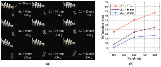 Firstly, some experiments with different pre-tensions of elastic elements are conducted to exhibit the variation in stiffness properties. Two groups of wires have equal contraction lengths, denoted as . To simplify the expression, we define as . Concretely, the tensegrity body with three contraction lengths ( = 0 mm, 10 mm, 20 mm) are considered and three kinds of weights (100 g, 300 g, and 500 g) are employed as the load adding to the tensegrity body. The vertical deformation is used as an indicator to quantify the difference in body stiffness. Finally, the tensegrity body deformations under these situations are presented in Figure 3a. It can be observed that as the weight increases, the deformation also increases. Moreover, when applying the same weight load, tensegrity bodies with different contraction lengths exhibit varying degrees of deformation which indicates the different stiffness of the compliant body. This implies that by adjusting the length of driven wires within the body structure, its overall stiffness can be modified accordingly. The deformation values are also measured and shown in Figure 3b. Notably, as for the same load, the deformation of the body with = 0 mm is larger than that of other situations. And the deformation of the body with = 20 mm is minimum. With the same load, the large deformation usually indicates the small body stiffness. Despite identical increments in contraction length, the resulting changes in deformation exhibit non-uniform patterns and diminish gradually. This indicates an inherent heterogeneity in stiffness variation. In the case of our designed tensegrity body, a larger contraction length yields a correspondingly smaller deformation value, thereby implying enhanced overall body stiffness.
