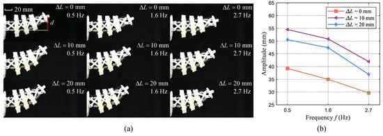Illustration of the designed tensegrity body’s oscillation amplitude variation. (a) Maximum oscillation amplitude of the tensegrity body under different frequencies and contraction lengths. (b) Oscillation amplitude comparisons of the tensegrity body under different frequencies and contraction lengths.