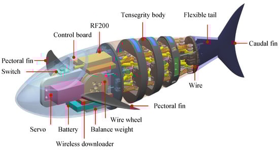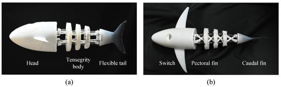 By integrating the proposed tensegrity robotic fish body, a novel robotic fish is designed, as illustrated in Figure 5. To reduce the drag during the swimming motion, a body profile with a well-streamlined shape is adopted. The tensegrity robotic fish mainly comprises three parts: a rigid head, a tensegrity body, and a compliant tail with a caudal fin. The head cabin with a pair of pectoral fins is 3D-printed and utilized to contain electronic modules and servo motors. A control board with a communication module is used to receive the commands and generate control signals. Two servo motors are used to actuate the wires on each side of the tensegrity body. Wire wheels with a diameter of 30 mm are employed to amplify wire drive length. Due to space constraints, the pectoral fins remain fixed in position. To improve the propulsion capability, a composite tail including a caudal fin is designed.