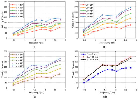 Measured swimming velocity of the designed tensegrity robotic fish versus oscillation frequency and amplitude. (a) Swimming velocity with a contraction length of = 0 mm. (b) Swimming velocity with a contraction length of = 10 mm. (c) Swimming velocity with a contraction length of = 20 mm. (d) Swimming velocity comparisons with different contraction lengths ().