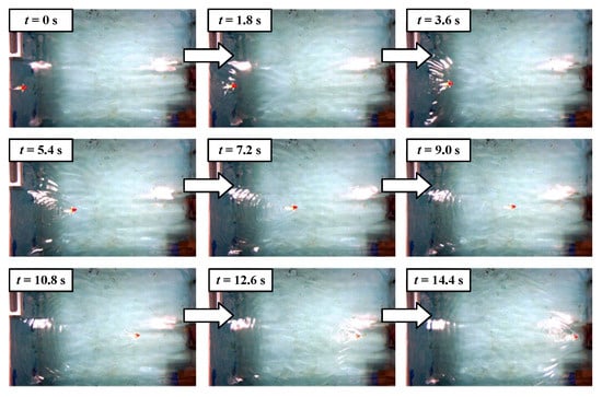 As illustrated in Figure 7, it is evident that the oscillation frequency and amplitude play significant roles in the swimming velocity. The increase in oscillation amplitude leads to a corresponding rise in swimming velocity while augmenting the frequency exhibits an overall increasing trend. However, for each case, there are slight declines observed within the intermediate range of frequencies. As presented in Figure 4, due to limitations imposed by the employed servo motor, higher oscillation frequencies result in reduced actual amplitudes of the tensegrity body’s oscillations, consequently causing a minor decrease in swimming velocity. After that, with the increase in frequency, the velocity will further increase. In these experiments, the maximum swimming velocities of each contraction length are 191 mm/s (0.53 BL/s, = 0 mm), 295 mm/s (0.84 BL/s, = 10 mm), and 281 mm/s (0.83 BL/s, = 20 mm), which are all obtained at the maximum oscillation frequencies (about 2.75 Hz) and amplitudes (). The snapshot sequences of the swimming motion with maximum velocity are presented in Figure 8. The swimming experimental videos are provided in the Supplementary Materials.
