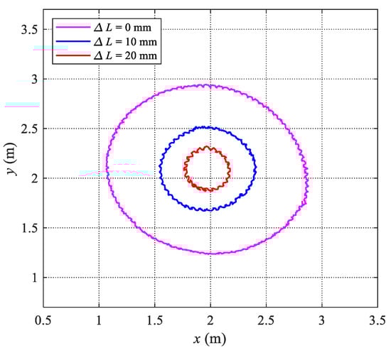 As for the existing tensegrity robotic fish, the maneuverability is usually less considered. To realize the asymmetric undulation propulsion of the tensegrity body, two servo motors rotate in a sinusoidal form with an offset, namely, . When the offset angle , the oscillation of the body is asymmetrical and a steering motion can be performed. During the steering motion testing, the procedure has been preset to the controller of our robotic fish. We only need to send the parameters (A, f, , and B) to the robotic fish by a wireless module once. The robotic fish will perform the corresponding steering motion automatically. We are mainly concerned about the turning radius and the average angular velocity of the designed tensegrity robotic fish. These indicators are determined by the oscillation frequency and the offset of the oscillation. Therefore, in the steering motion experiments, the maximum oscillation frequencies and maximum offsets for the tensegrity robotic fish with three contraction lengths are given, and the steering motions are recorded by a global camera. As illustrated in Figure 9, these steering motion trajectories are obtained. Furthermore, the turning periods and average angular velocity are also measured. The detailed steering motion performance is tabulated in Table 3. As for the three cases, the maximum steering radius of 900 mm (2.5 BL) and the minimum angular velocity of 10.8°/s are all obtained by the robotic fish with a contraction length of 0 mm. The maximum angular velocity and minimum radius are 46.6°/s and 230 mm (0.68 BL), respectively, which are all obtained by the tensegrity robotic fish with a contraction length of 20 mm. The corresponding steering motion sequences are presented in Figure 10. The steering experimental videos are also provided in the Supplementary Materials. Furthermore, our findings indicate that while swimming velocity is minimally affected by body contraction length ( 10 mm or 20 mm), there is a significant influence on steering motion.