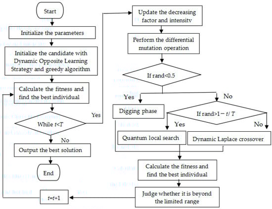 Step One. Initialize the population by Equation (1), perform the dynamic opposite learning population with Equation (10), and retain the optimal individuals according to the greedy strategy to enter the main program iteration.