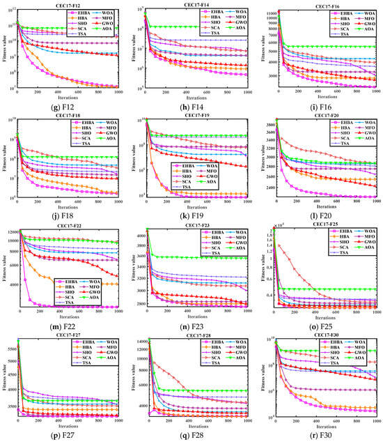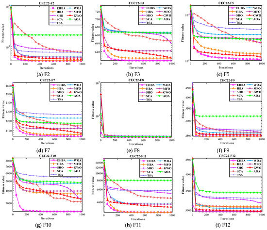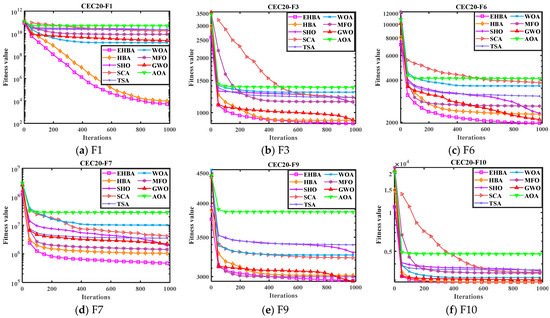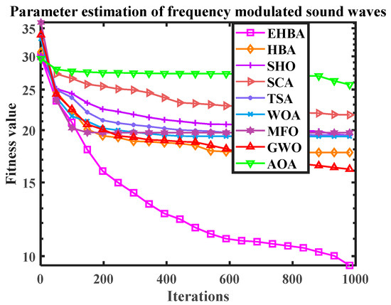 EHBA is applied to deal with the issue of parameter estimation, and the results of EHBA with the original HBA, SHO, SCA, TSA, WOA, MFO, GWO, and AOA are compared. Table 13 lists the best results obtained by all comparison methods. From this, the result obtained by the EHBA are relatively small, indicating that the algorithm has high solving accuracy. In addition, Table 14 presents the statistical results of all methods running 20 times. The bold data are the best value calculated by comparing the algorithms under each indicator (optimal value, worst value, average value, standard deviation). Observing the bold data, it can be seen that although EHBA has a large standard deviation, it can obtain smaller average values, optimal values, and worst values. Therefore, overall, the solution effect of EHBA is relatively good. In addition, the convergence curve diagram for the above methods is provided in Figure 14. The vertical axis is the logarithm of numerical results, which also adds to the proof of the efficiency of EHBA developed in this paper.