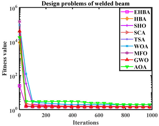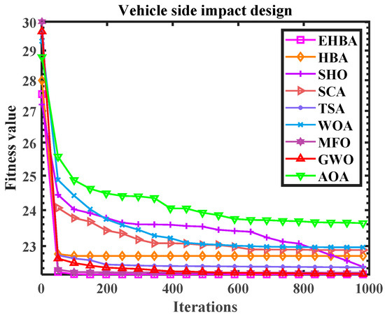 EHBA was implemented to deal with this case and the calculation values were compared with those of HBA, SHO, SCA, TSA, WOA, MFO, GWO, and AOA. Table 11 shows the best values and corresponding variable values for solving the car side impact design problem.