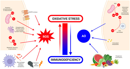 ROS and antioxidant (AO) generation and sources in the body. Made in ©BioRender-biorender.com.