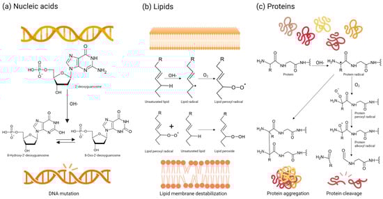 Main reactions between ROS and biomolecules, and detrimental effects of ROS in the body. (a) DNA alterations by ROS. (b) Lipid peroxidation by ROS. (c) Protein modifications by ROS. Made in ©BioRender-biorender.com.