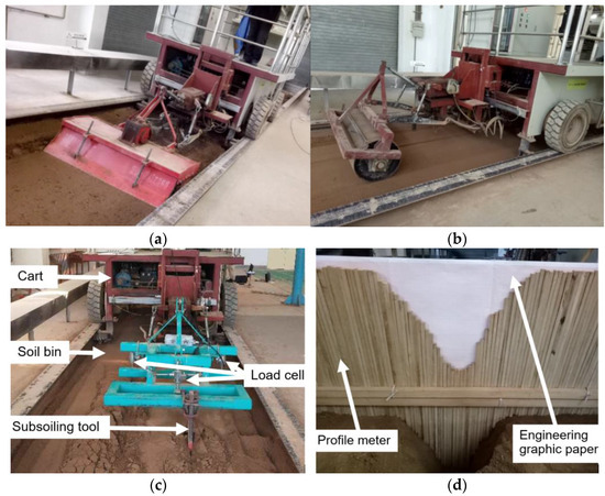 Lab soil bin test: (a) rotary tillage of the soil, (b) soil compaction, (c) subsoiling test, (d) soil disturbance profile measurement.